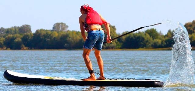 Remo sobre tabla en el dique, actividad ideal para principiantes, equilibrio y diversión.
